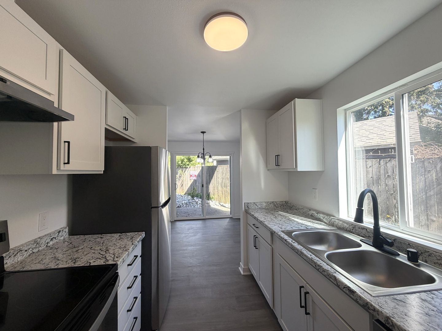 This fully renovated ground-floor 2-bedroom, 1-bath unit has been updated with modern finishes throughout, including brand-new LVP flooring, fresh paint, and a designated dining area with a sliding glass door that opens to a patio and private side yard. The kitchen features stainless steel appliances including a refrigerator, stove/oven, hood vent, dishwasher, and double-basin sink, along with ample storage. Additional highlights include two hallway closets, spacious bedrooms, and an updated bathroom with a full-size shower/tub and black finishes.