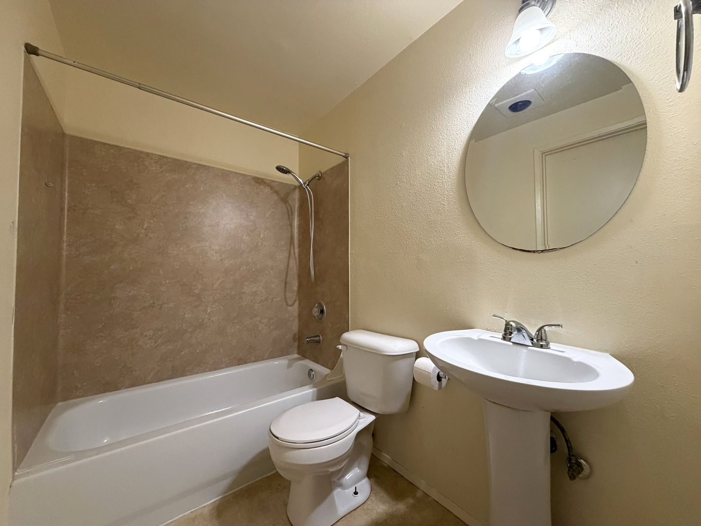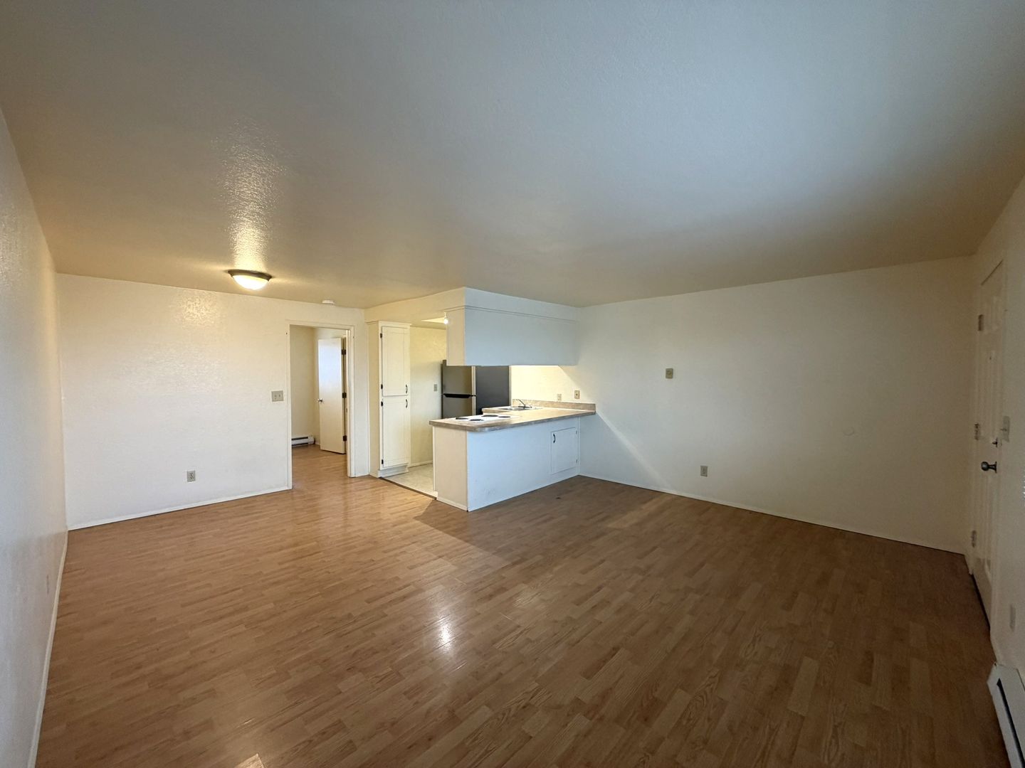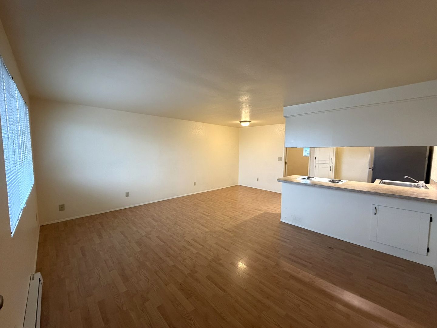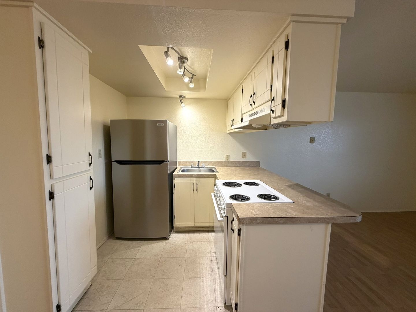 Top-floor 1 bed, 1 bath apartment offering a bright and comfortable living space with a functional layout. The kitchen provides ample counter space along with additional storage, including a tall cupboard with shelves and an overhang for bar seating. The bathroom features a full-size shower and tub, a pedestal sink, and a unique in-bathroom closet for added convenience. Enjoy beautiful mountain views right from your living room, just outside your door, all within approximately 550 sq ft.